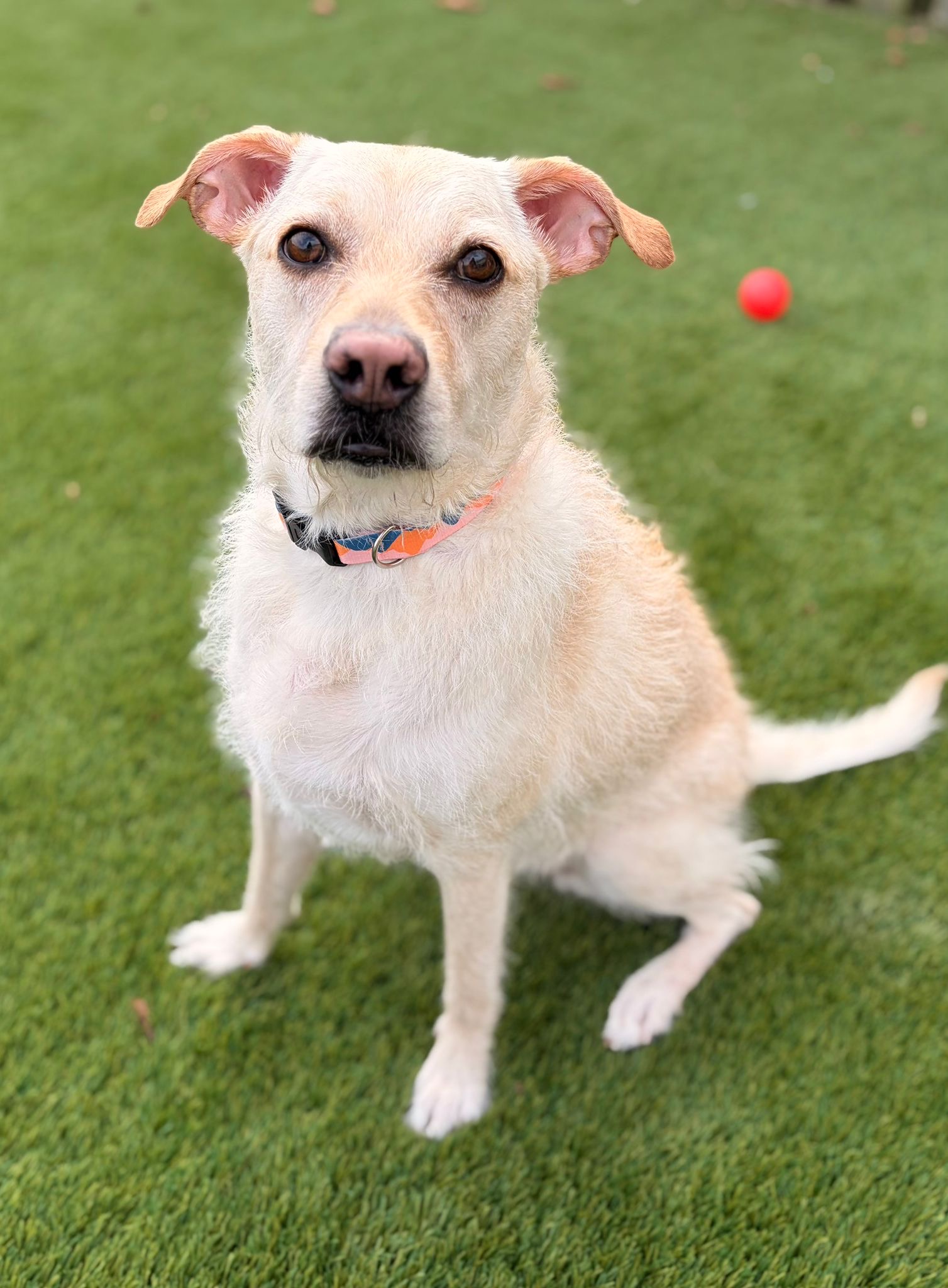 Boo has a playful side and loves a good game of fetch! She gets along well with other dogs and enjoys playing, though she’s also happy doing her own thing and relaxing nearby.