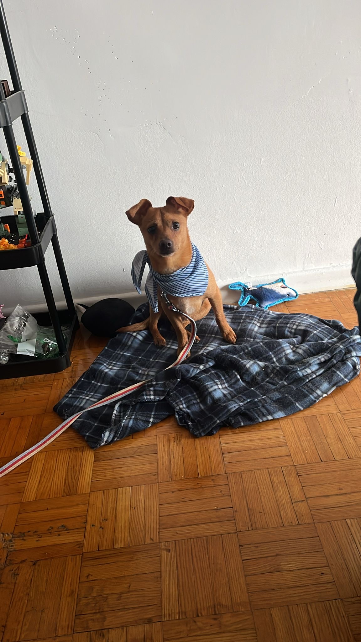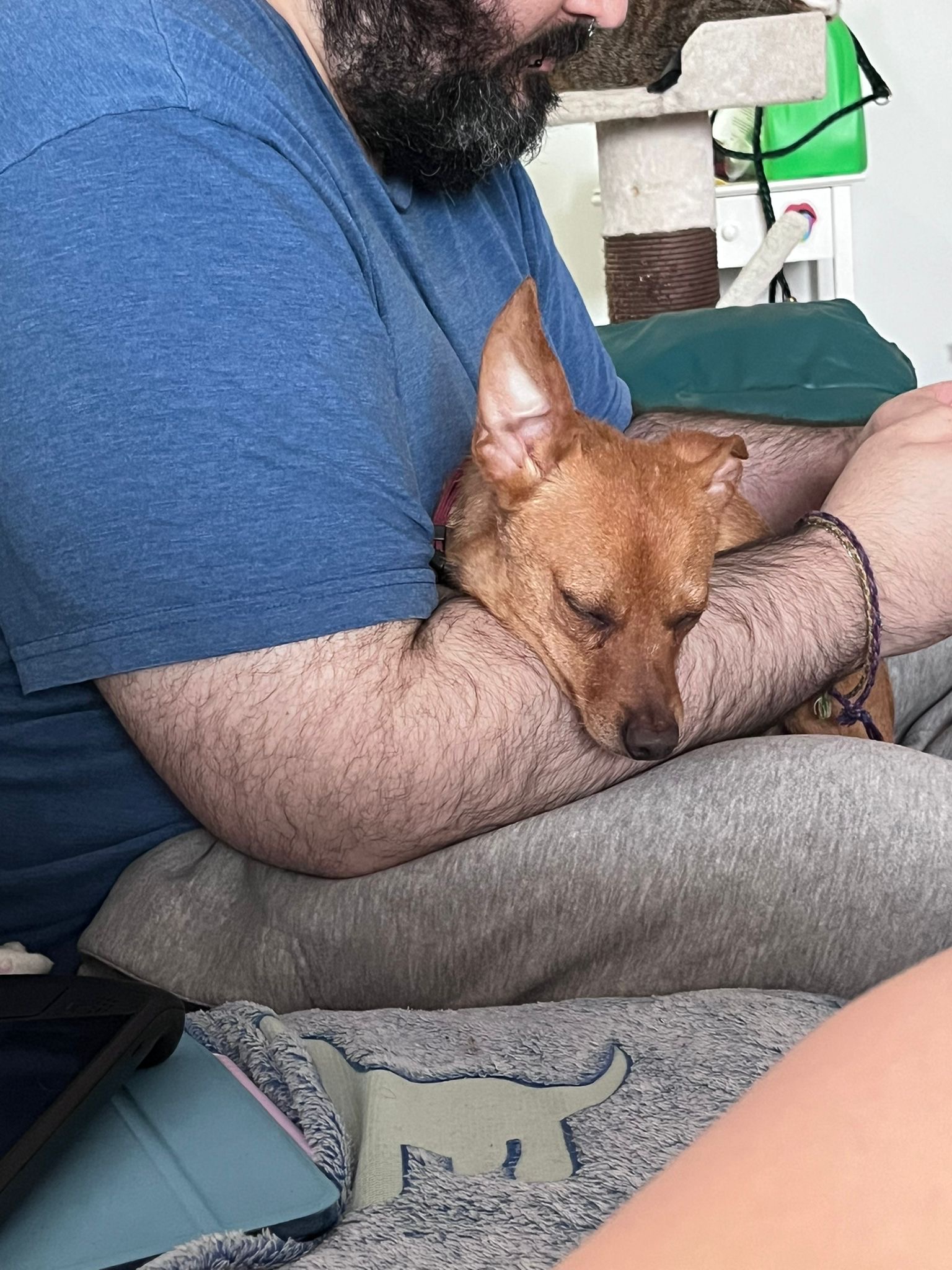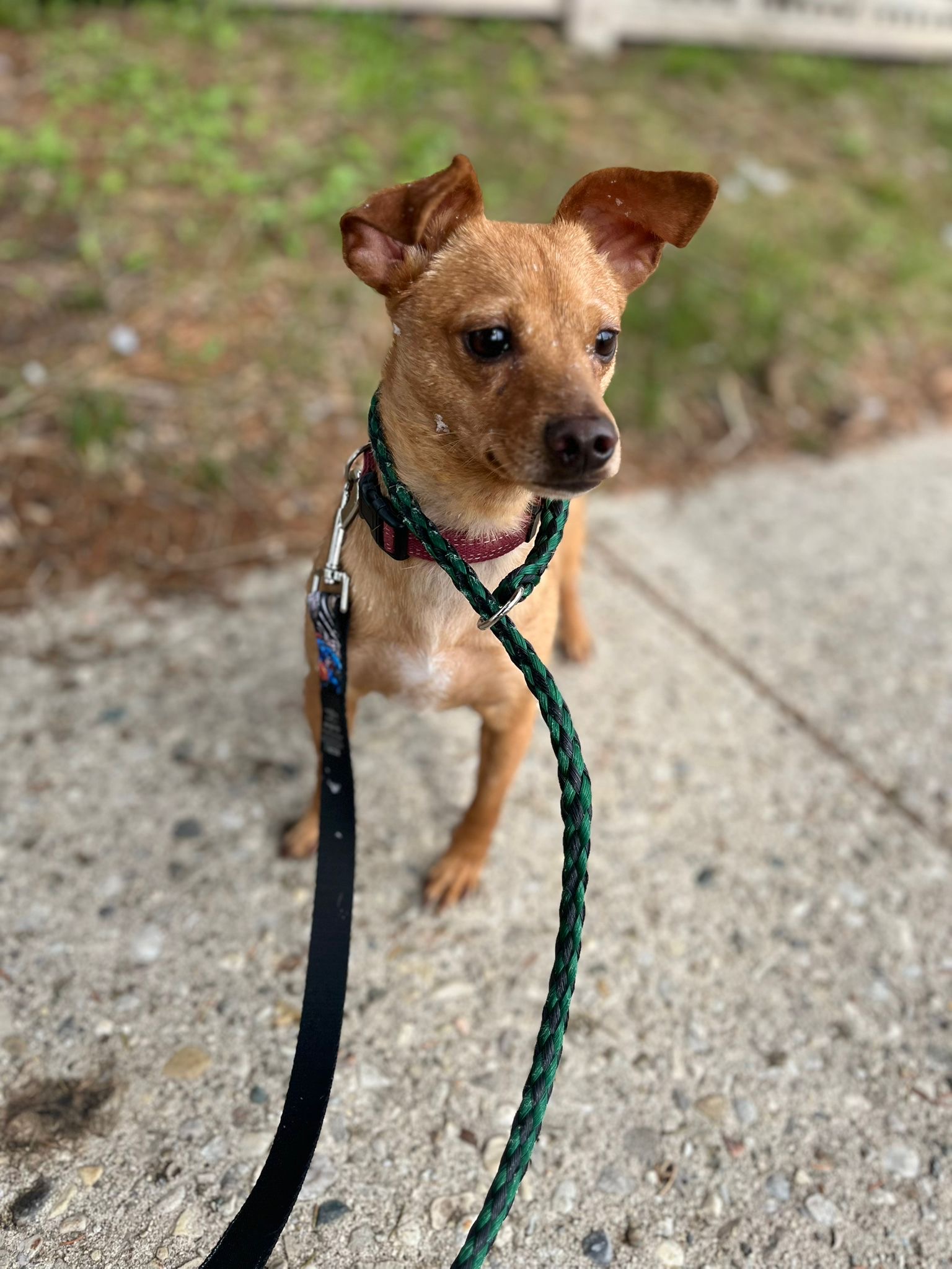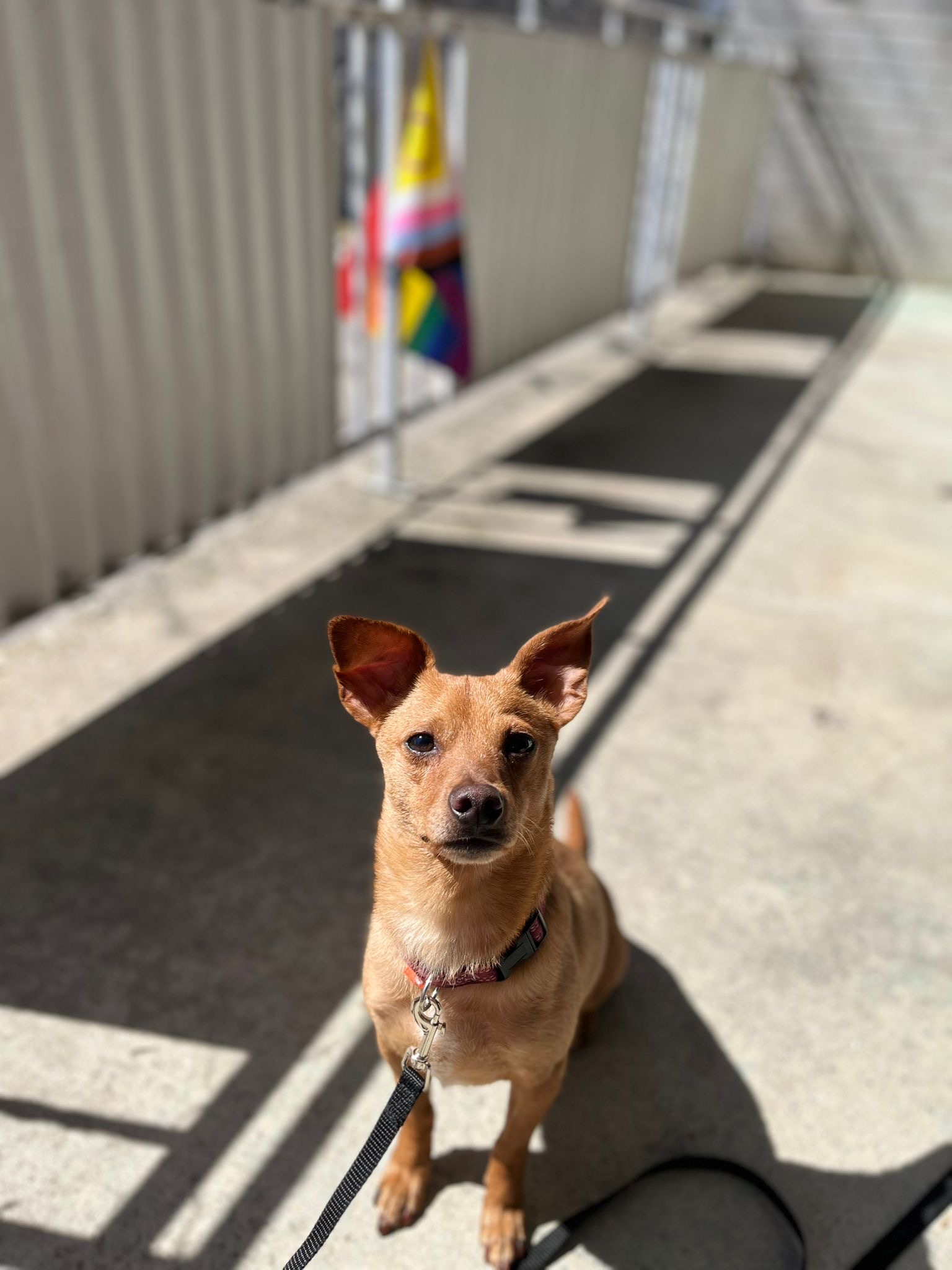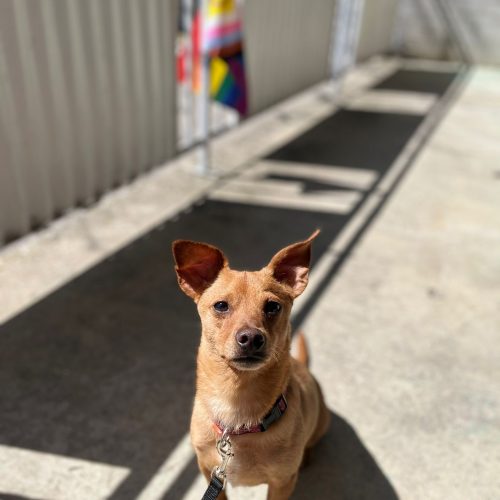 He’s currently working on his crate and house training. Micheal is crated when home alone and overnight and while he may take a little time to settle, he’s making steady progress. Since Micheal loves being around his humans, he does show some mild signs of separation anxiety. A home where someone is around more often, or where he can continue building confidence at his own pace, would help him truly thrive. He’s also improving with his house training and continues to do well with consistency and routine. He walks politely on leash and is generally confident outdoors, though he can become startled by unfamiliar sights or sounds. While Micheal is still building confidence around other dogs, he happily coexists with cats, making him a great fit for a feline-friendly home.