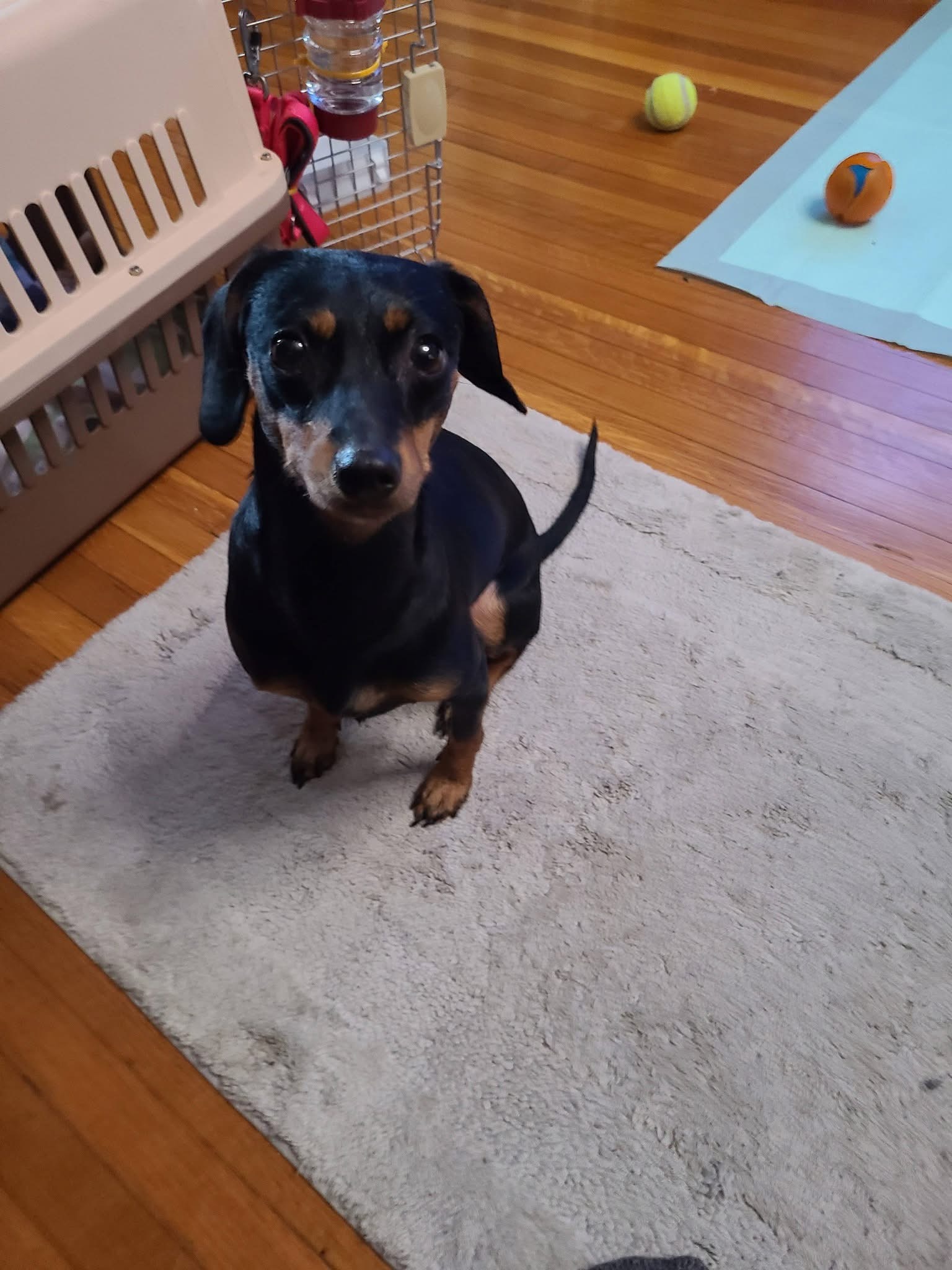 She is currently working on house training and does best when taken out regularly and rewarded for success. She’s comfortable spending short periods in her crate, which is also where she sleeps at night.